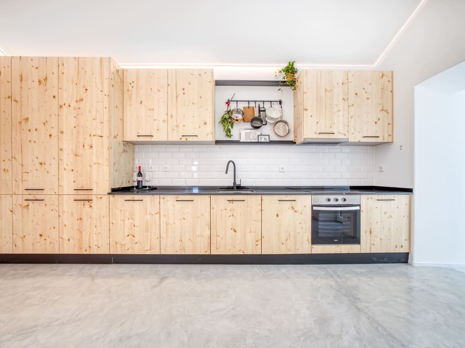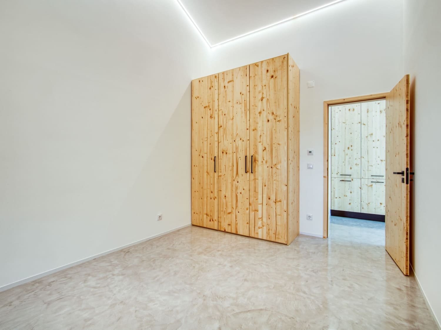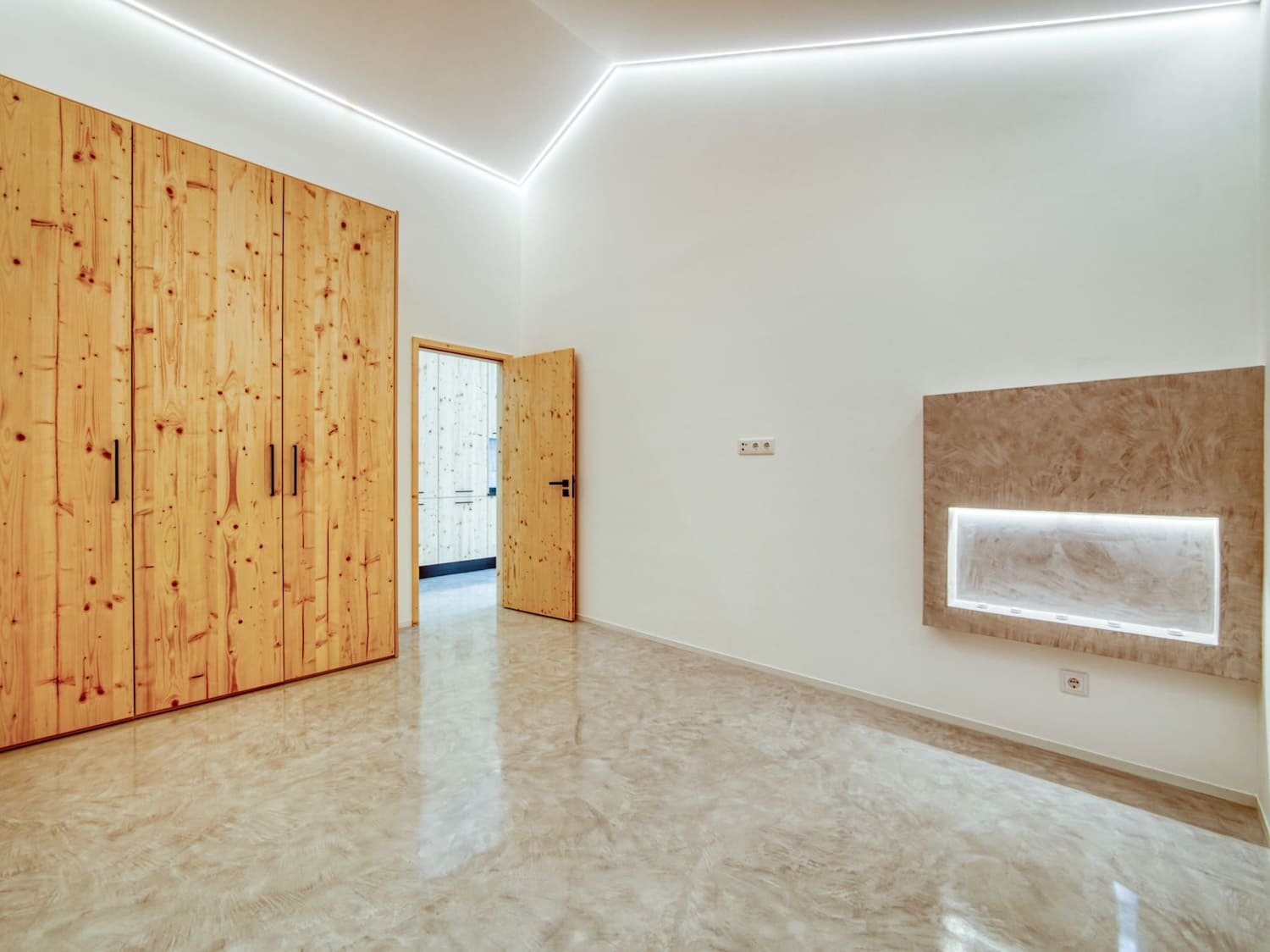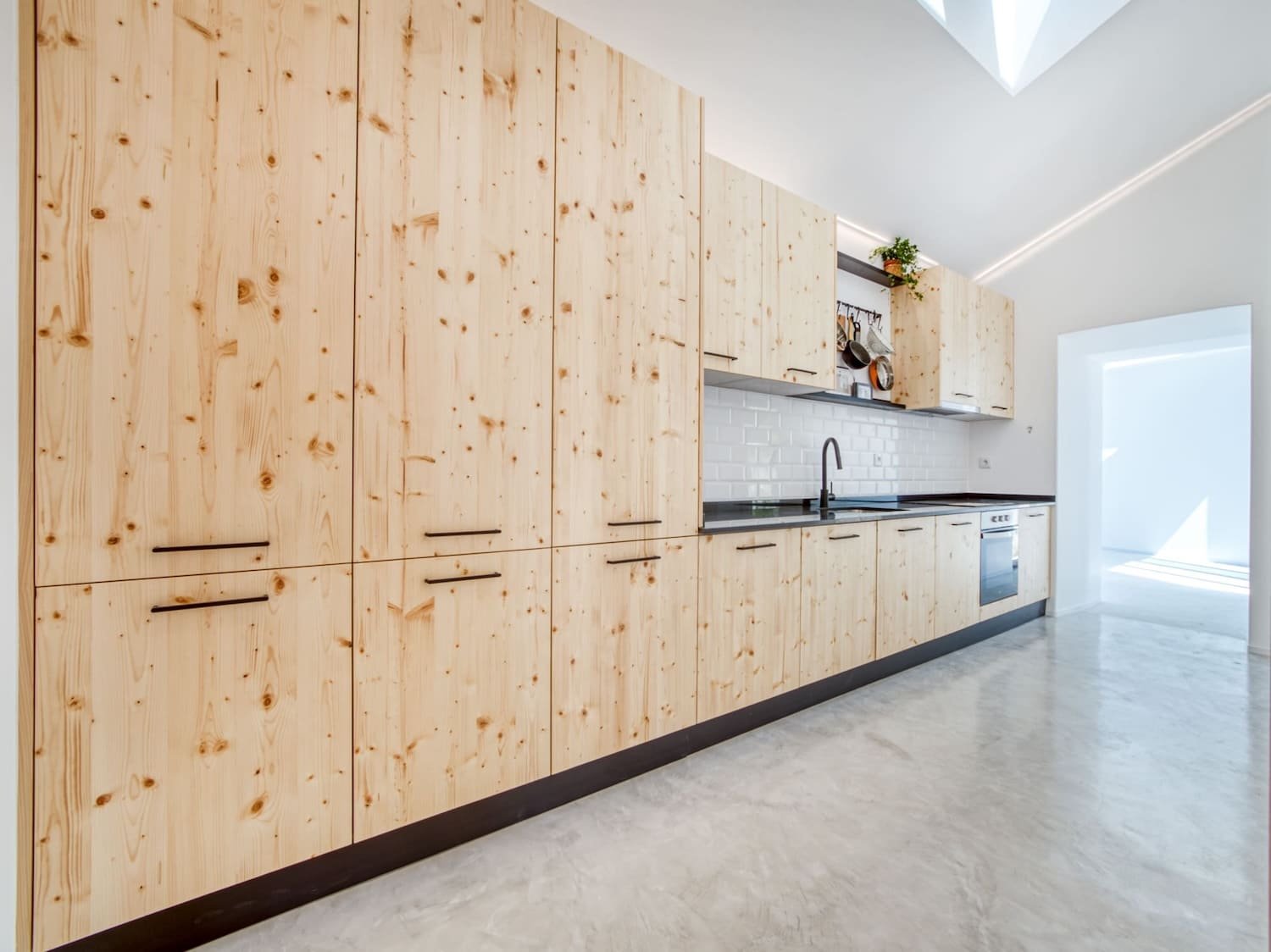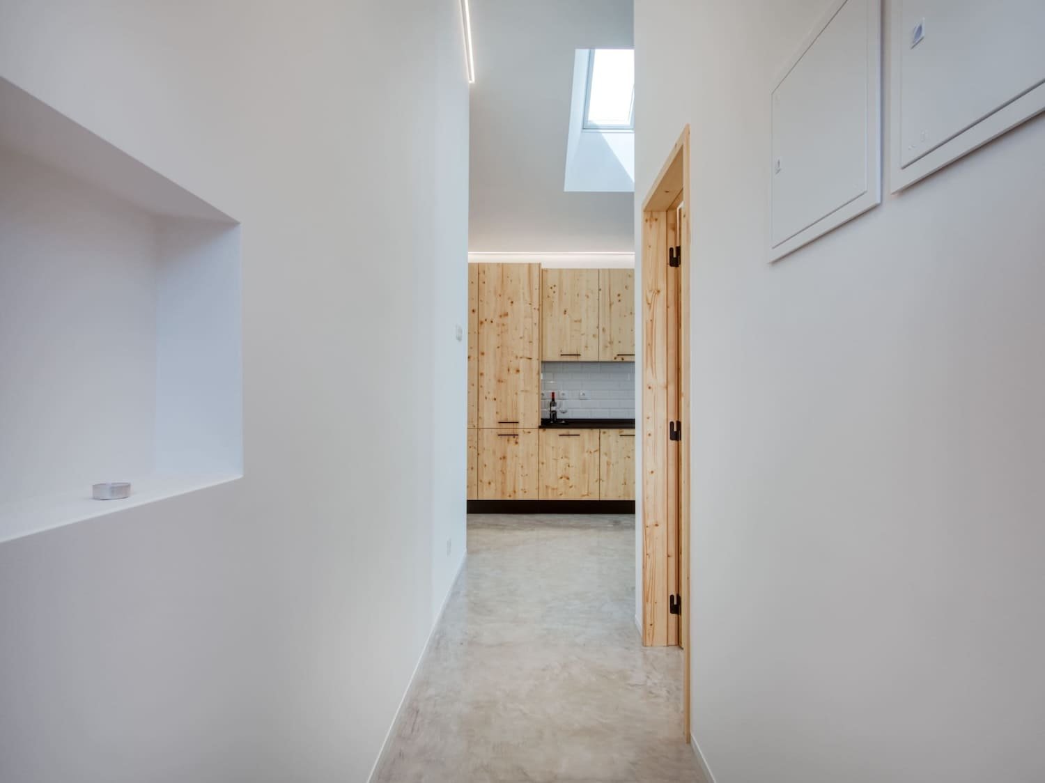 A zona privada foi reorganizada, resultando num quarto com instalação sanitária privativa e áreas de arrumação integradas. A madeira assume um papel central no conceito do projeto, funcionando como elemento condutor da linguagem estética e contribuindo para uma atmosfera acolhedora, equilibrando o carácter tradicional da construção com uma abordagem contemporânea.